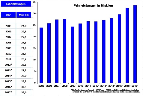 Conform statisticii publicate de Bundesamts für Güterverkehr (BAG), distanța parcursă de camioane străine pe rețeaua de drumuri federale supuse taxării a crescut în 2017 cu 3.3% față de 2016.