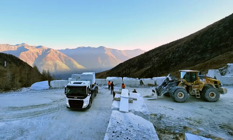 Transportul marmurei Covelano, renumită pentru calitatea sa superioară, presupune traversarea unor rute extrem de solicitante din Parcul Național Stelvio, cu diferențe de altitudine de aproape 1.500 de metri.