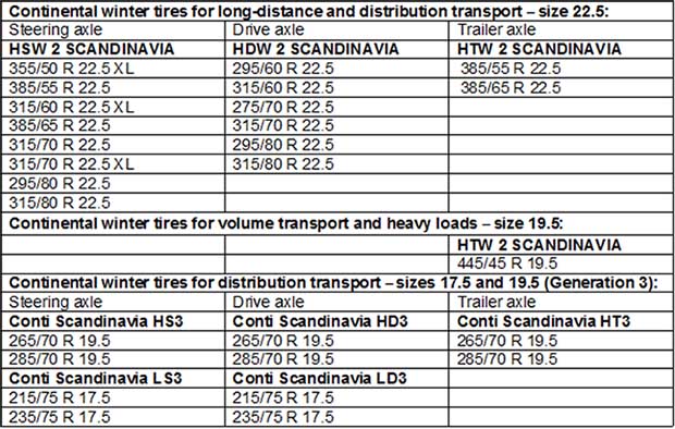 Prin gama de anvelope de iarnă Scandinavia, Continental oferă un portofoliu complet atât pentru camioanele de distribuție (dimensiuni 17.5 și 19.5 inch) cât și în transportul pe distanțe lungi (dimensiuni 22.5 inch). Gama include și anvelopa Continental HTW 2 Scandinavia 445/45 R19.5 pentru remorcă și o anvelopă de iarnă specială pentru semiremorci mega pentru importantul segment de transport de volum și greu.