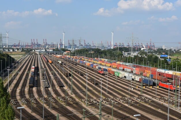 Peste 135 de milioane de tone de mărfuri sunt procesate anual în Portul Hamburg, cel mai mare port universal din Germania, o mare parte din această cantitate ieșind din port pe calea ferată.