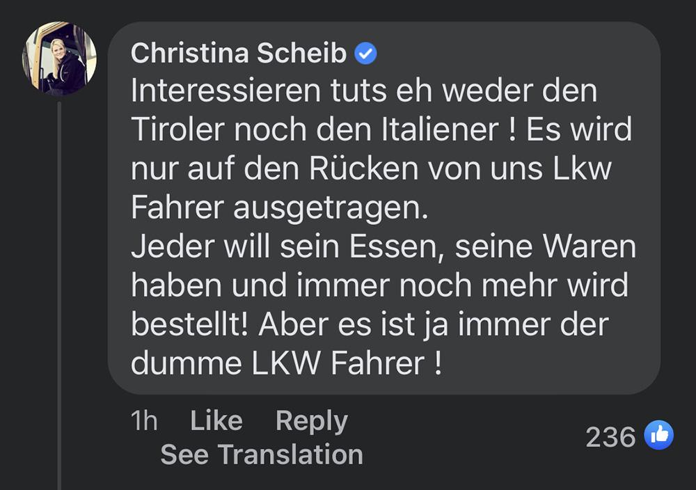 ”Nici tirolezul, nici italianul nu sunt interesați oricum! Se transportă numai pe spatele șoferilor de camion. Toată lumea își dorește mâncarea, bunurile și se comandă mereu mai mult! Dar cel mai prost cade întotdeauna șoferul de camion!”
