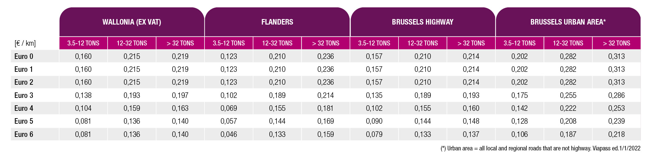 Începând de sâmbătă, 1 ianuarie 2022, intra în vigoare noile tarife de taxare rutieră pentru vehicule comerciale de peste 3.5 tone, inclusiv cele din categoria N1 (cod caroserie BC), în Valonia. Deoarece au fost majorate la 1 iulie 2021, tarifele de taxare rutieră în Flandra și Bruxelles nu se modifică.
