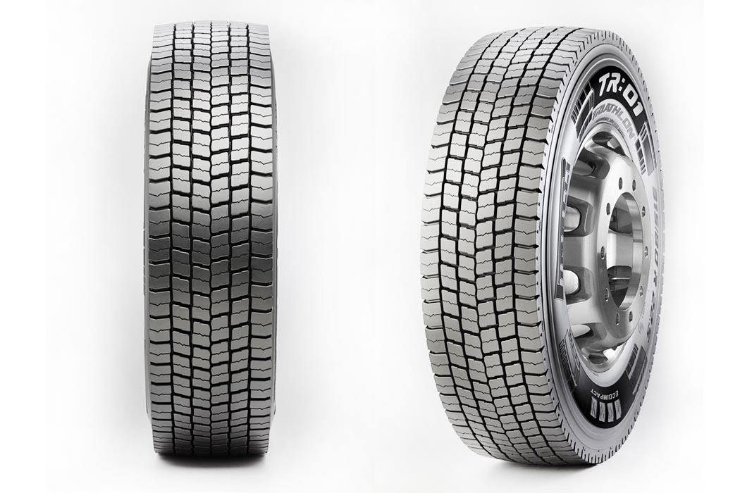 Anvelopa pentru axa motrică, TR:01 Triathlon este caracterizat de un design complet nou. Acesta optimizează geometria blocurilor de profil și a canelurilor transversal pentru a garanta o durată de viață mai lungă, o scăredere a rezistenței la rulare, o mai bună tracțiune, o uzură uniformă și o mult mai eficientă eliminarea pietrelor. Profilul 3D asigură o aderență și o tracțiune constantă chiar și în condiții de iarnă, în timp ce manevrabilitatea este optimizată atât pe ud cât și pe uscat. Profilul 3D lucrează ca o capcană care se deschide pentru a prelua zăpada asigurând astfel o aderență “zăpadă-pe-zăpadă” mai bună, făcând camionul mult mai manevrabil chiar și în condiții de aderență limită.