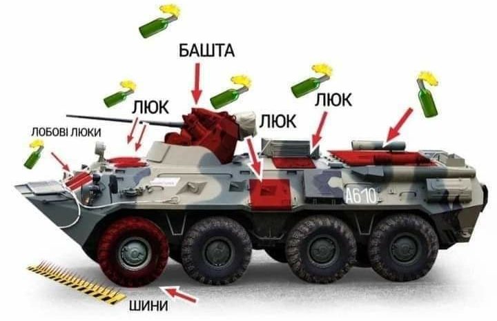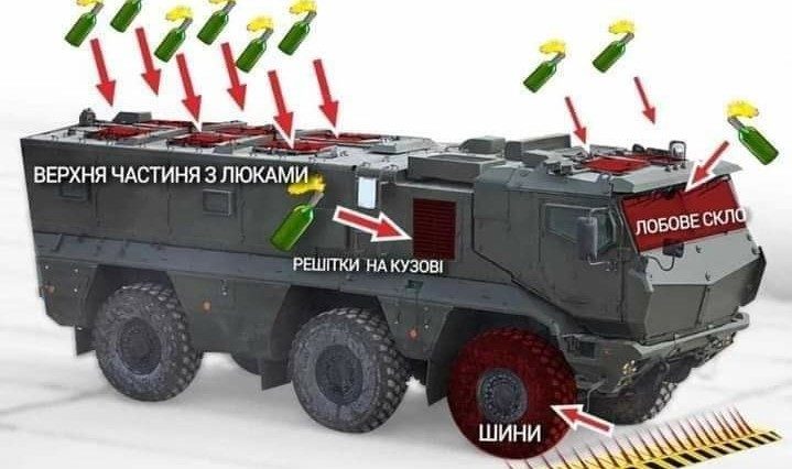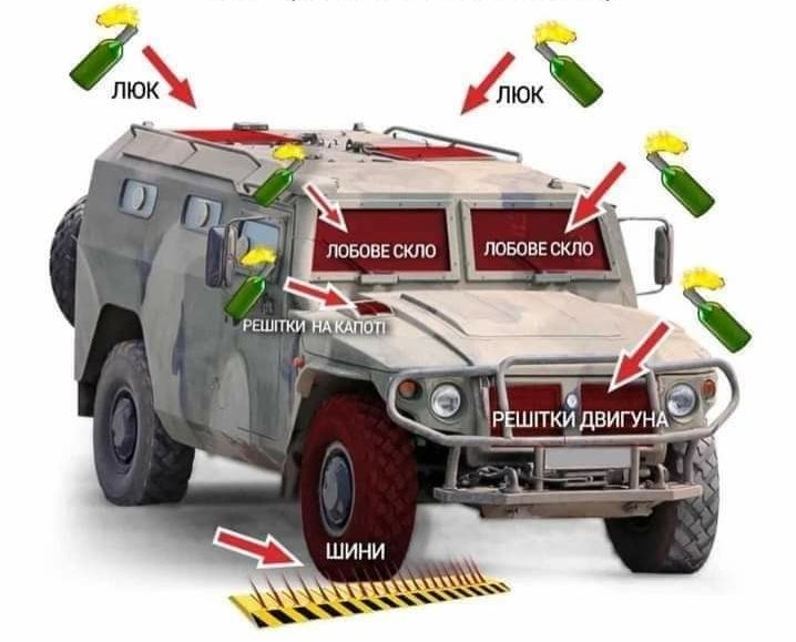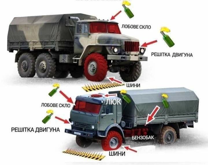 Materialul prezintă principalele camioane și vehicule blindate folosite de armata rusă și cele mai vulnerabile zone în care pot fi aruncate dispozitivele incendiare improvizate. De asemenea, în toate cazurile este recomandată folosirea dispozitivelor pentru înțeparea pneurilor.
