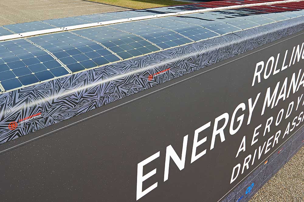 Panourile solare care echipează Optifuel Lab 2 au fost special dezvoltate pentru acest proiect. Acestea trebuie să răspundă unor constrângeri particulare: „Panourile solare au trebuit să urmărească profilul curbat al trailerului, pentru a nu interfera cu aerodinamicitatea vehiculului”, explică Claude Covo. „În același timp, acestea au trebuit să facă față condițiilor cu care se confruntă un camion pe șosea și oricărui incident care ar putea apărea. Astfel, n-am putut utiliza panouri standard.” Panourile solare dezvoltate pentru Optifuel 2 sunt ușoare, deformabile, echipate cu 48 module acoperind o suprafață de 40 mp, și generează cu 30% mai multă energie decât panourile standard.