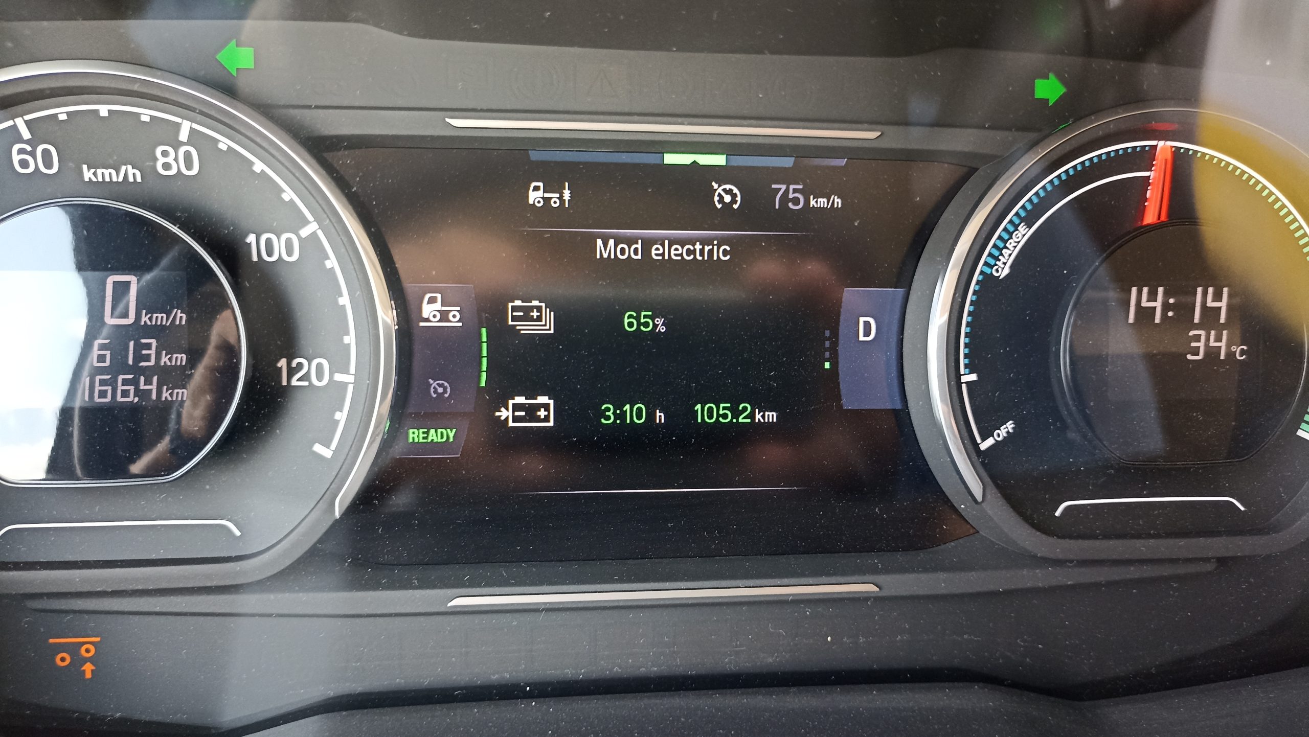 Camionul a fost conectat la stația de încărcare aproximativ 25 de minute, timp în care statusul bateriei a ajuns la 88%, iar cel al autonomiei la 134 km. De menționat că pentru scurt timp am văzut pe bord și valori ale bateriei de puțin peste 90%, numai că aceste valori, cel puțin în cazul în care sunt obținute de la o stație foarte rapidă, se ”topesc” rapid. Mult mai relevant este, astfel, indicatorul autonomiei disponibile. Practic, în 25 de minute am adăugat, teoretic, 60,3 km la autonomie.