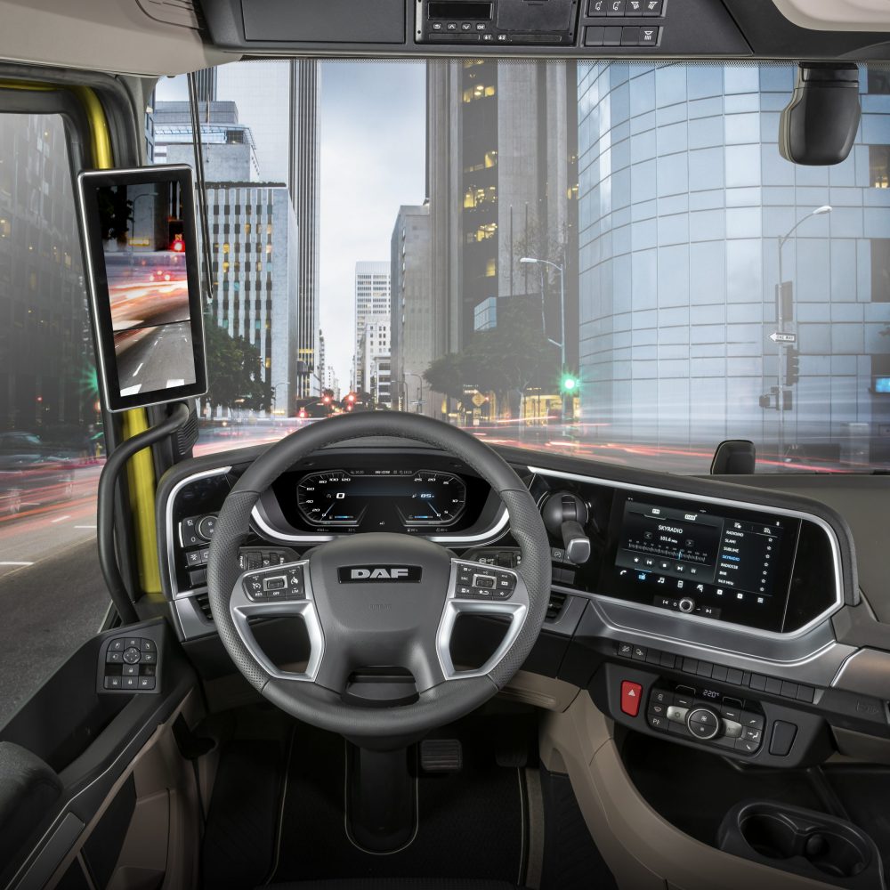 Sistemul de camere și ecrane este foarte asemănător cu cel de la Mercedes, dar există și diferențe. Cea mai importantă? DAF oferă o variantă digitală și pentru oglinda de colț (Corner View), ale cărei imagini se transmit într-un ecran suplimentar, montat sus, pe stâlpul parbrizului de pe partea pasagerului.