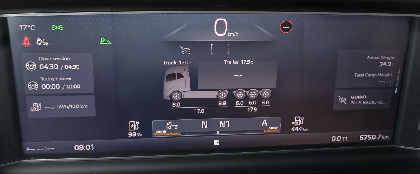 În testul nostru din Grecia am avut la dispoziție un cap tractor 4×2, a cărui semiremorcă a fost încărcată până la 35 de tone. În poza făcută înainte de începerea testului, pe panoul de instrumente se vede clar că autonomia estimată cu 98% din baterie este de 444 km.