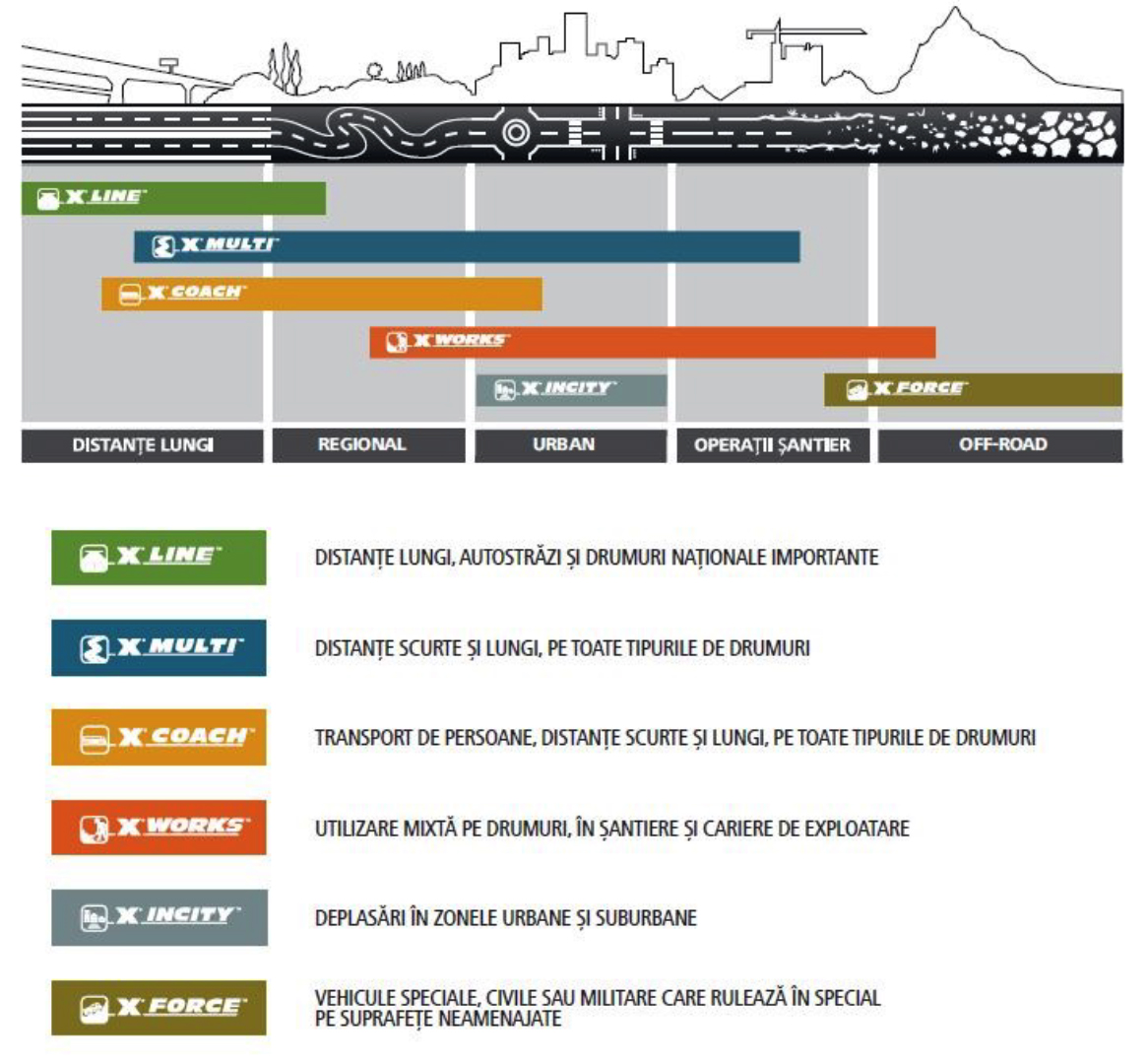Oferta de anvelope Michelin pentru vehicule grele include 6 game de anvelope, fiecare dintre acestea răspunzând unor nevoi diferite de utilizare ale transportatorilor.